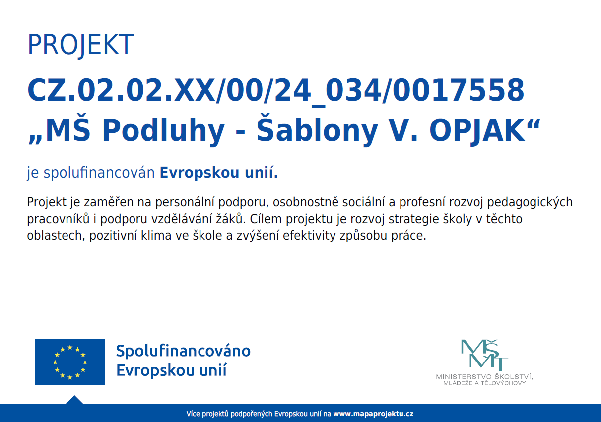 Od 1.7.2023 – 31.12.2025 je naše instituce realizátorem projektu „MŠ Podluhy – Šablony IV OPJAK“ s registračním číslem CZ.02.02.XX/00/22_002/0007940, který je spolufinancován Evropskou unií. Projekt je zaměřen na personální podporu a vzdělávání pracovníků. Cílem projektu je rozvoj strategie školky v těchto oblastech, pozitivní klima ve škole a zvyšování efektivity způsobu práce.